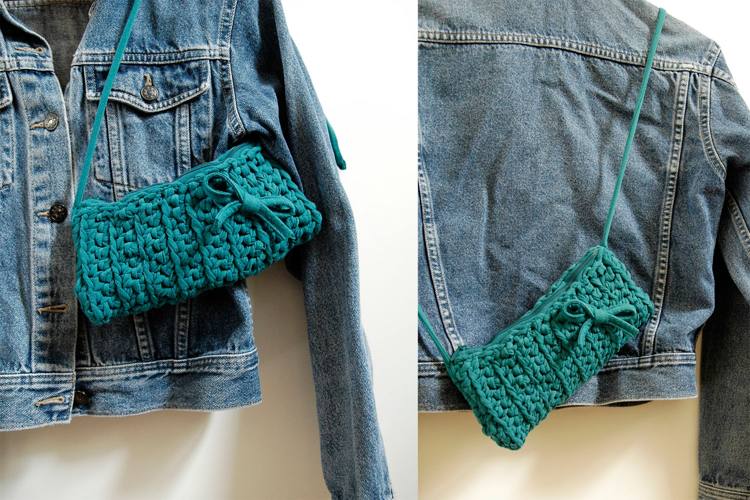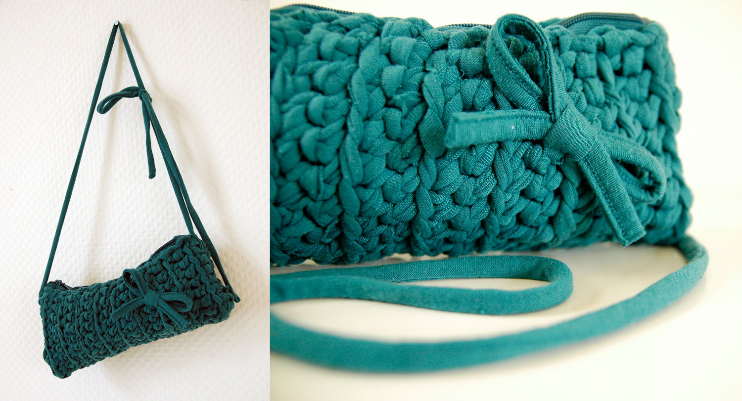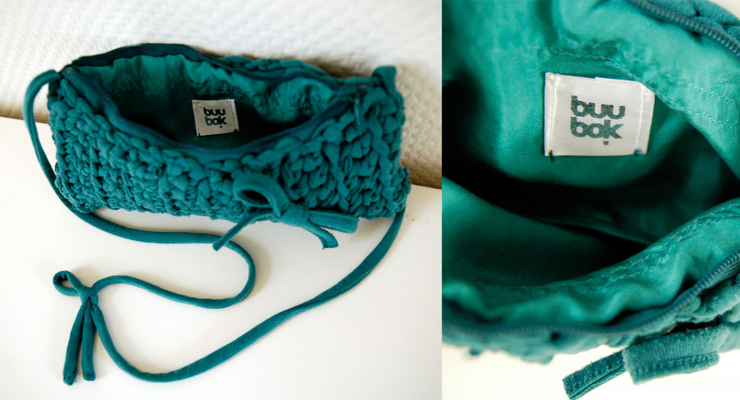 Hand crocheted from ‘t-shirt’ yarn. To make this purse Buubok used only material obtained from one shirt. The shirt is hand-cutted into strips to make a suitable yarn for crocheting. Other items such as decorations or strap are made from the elements of the same shirt also.