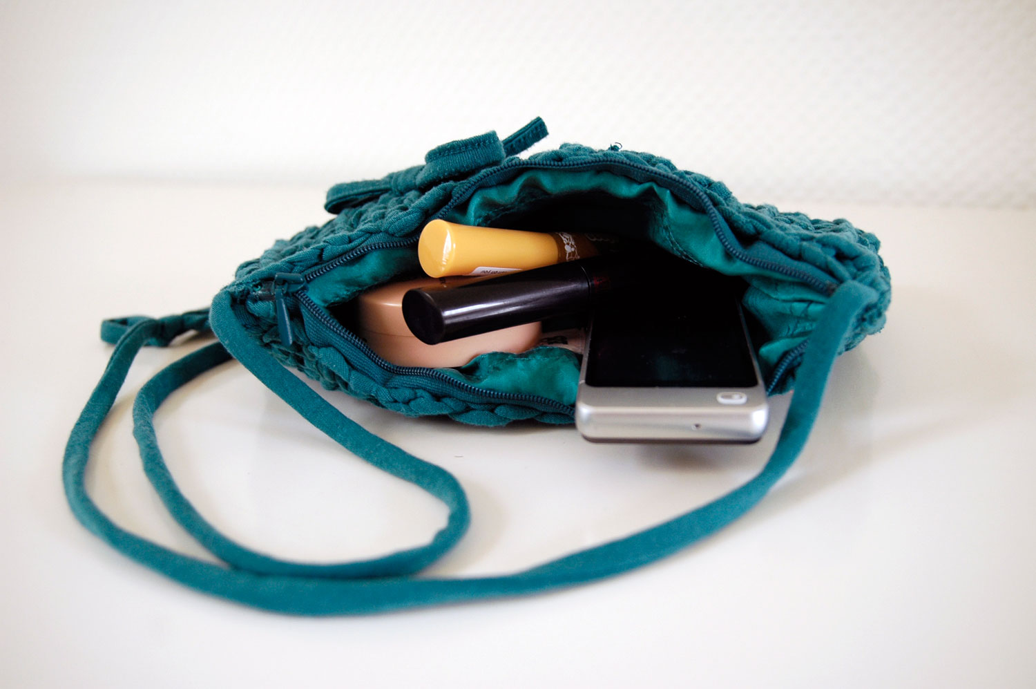 Zipped, with matching silk lining. Decorated with a textile bow.