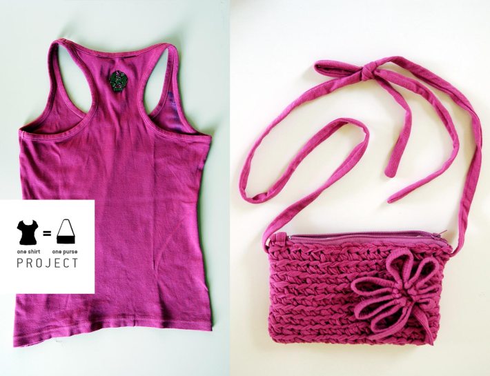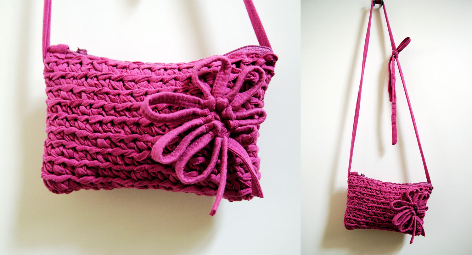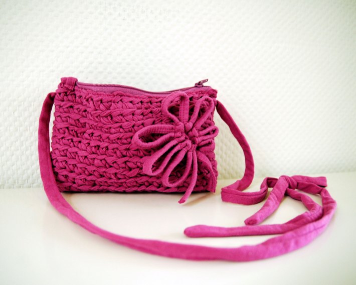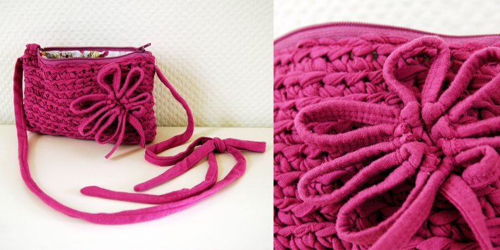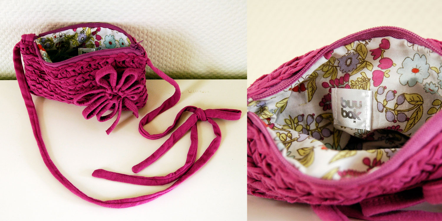 Hand crocheted from ‘t-shirt’ yarn. To make this purse Buubok used only material obtained from one shirt. The shirt is hand-cutted into strips to make a suitable yarn for crocheting. Other items such as decorations or strap are made from the elements of the same shirt also.