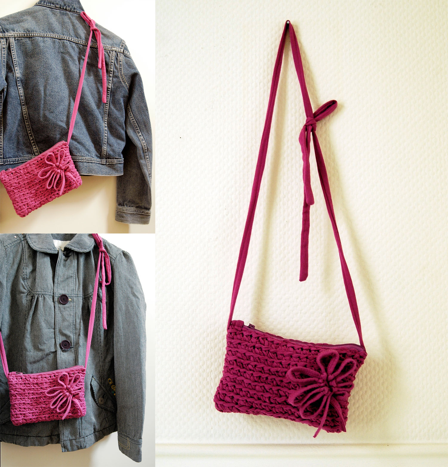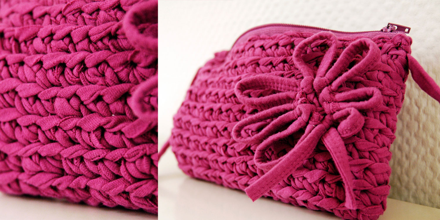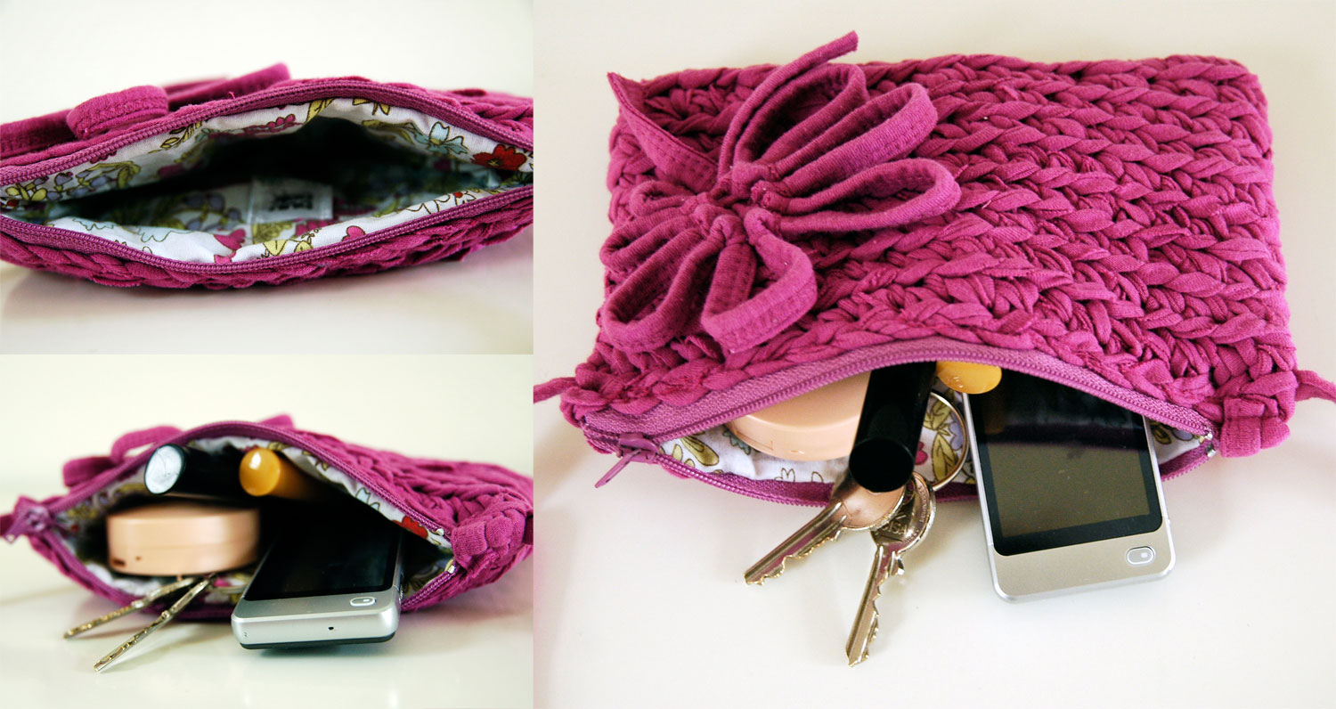 Hand crocheted from ‘t-shirt’ yarn. To make this purse Buubok used only material obtained from one shirt. The shirt is hand-cutted into strips to make a suitable yarn for crocheting. Other items such as decorations or strap are made from the elements of the same shirt also.