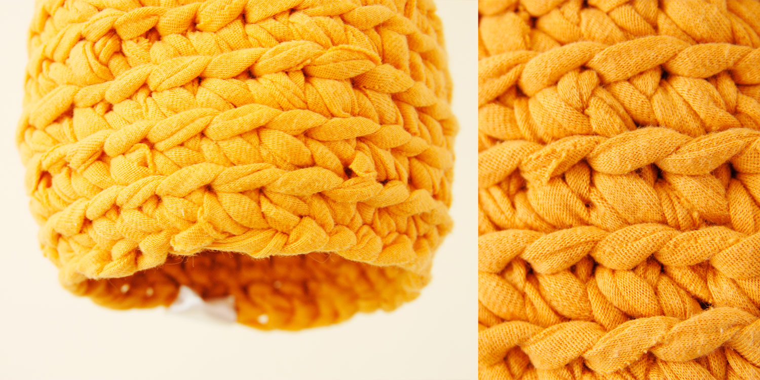 It’s made from hand-cutted recycled material from salvaged fabric.