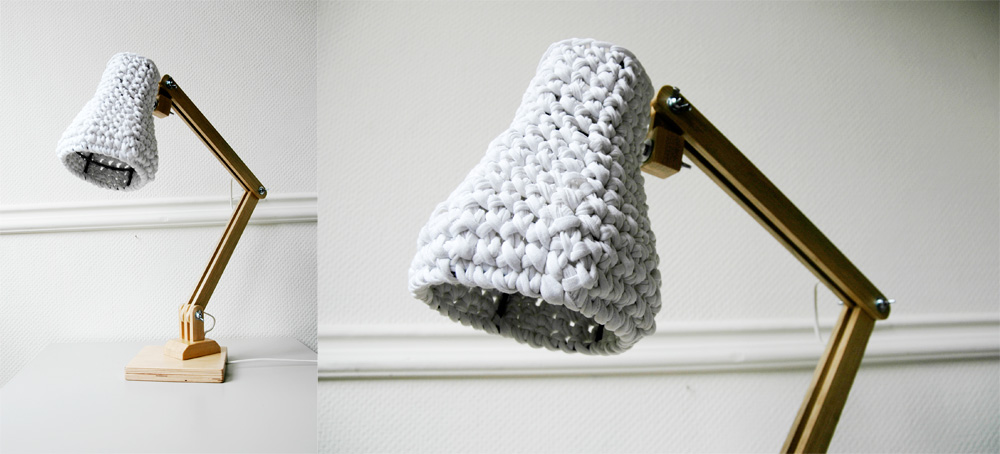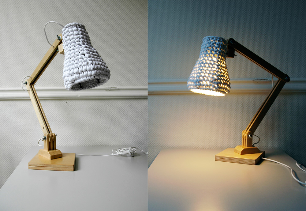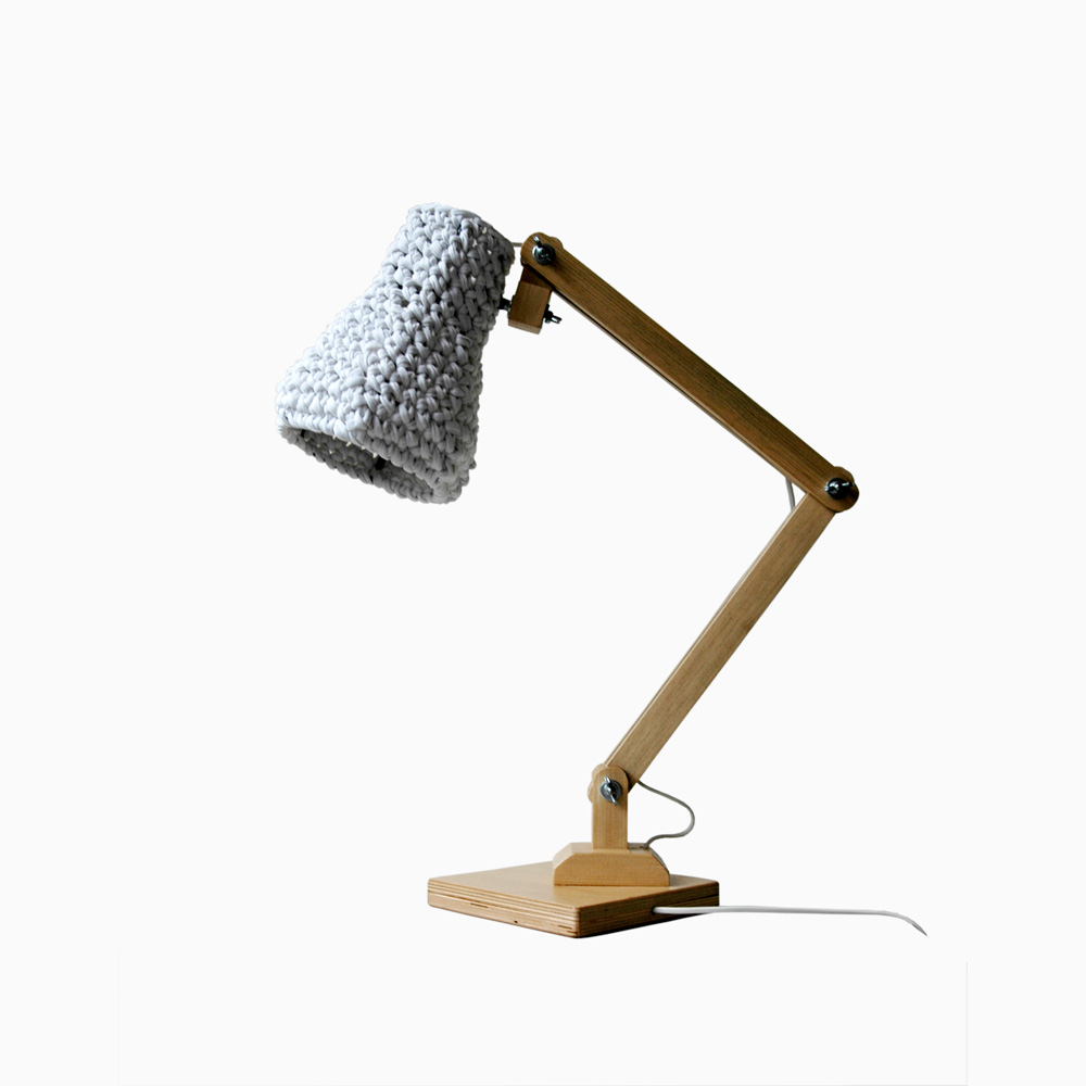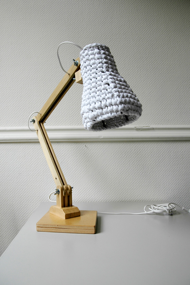 Fashionable. Unique. Wooden table lamp with crocheted shade.