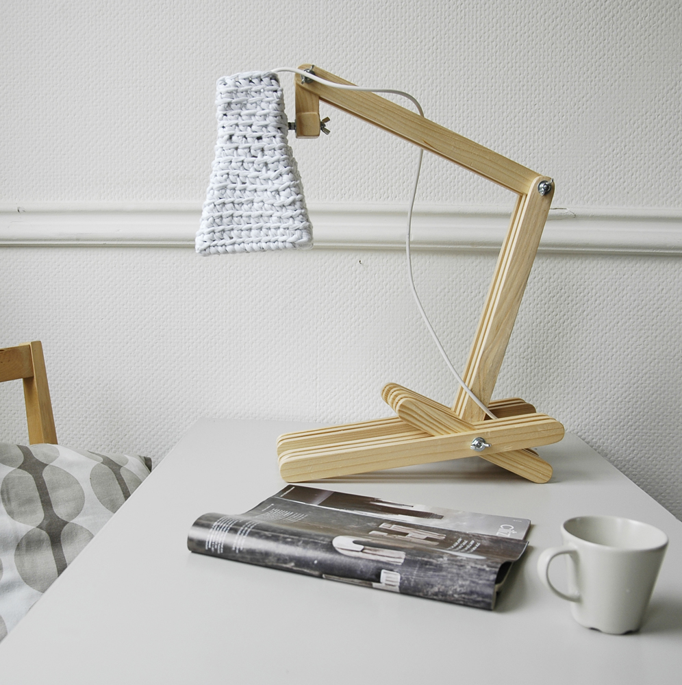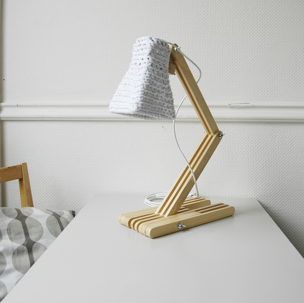 Wooden table lamp with crocheted shade.