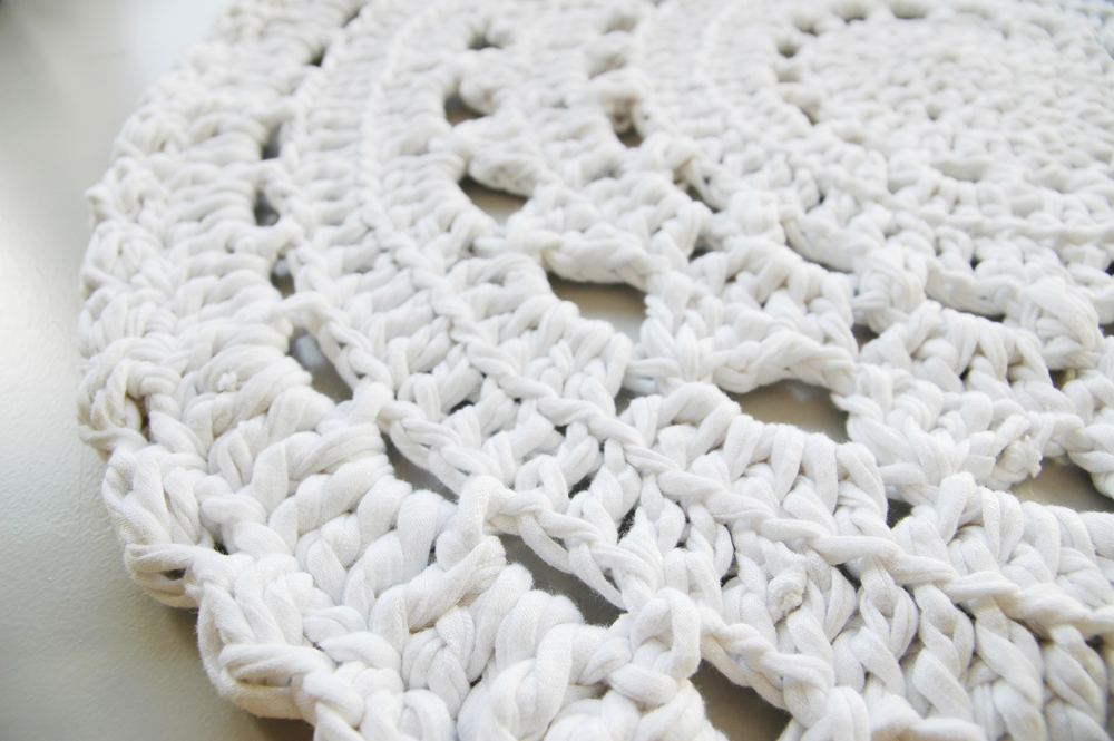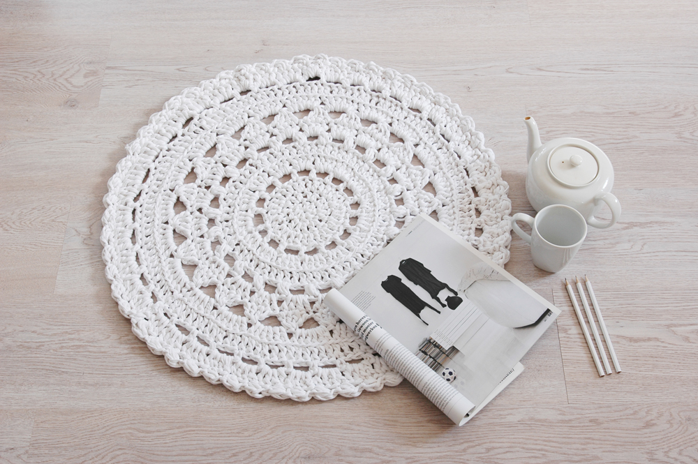Handmade crochet rug match pefect to the modern, boho, scandinavian, cottage style or shabby chic interior design.